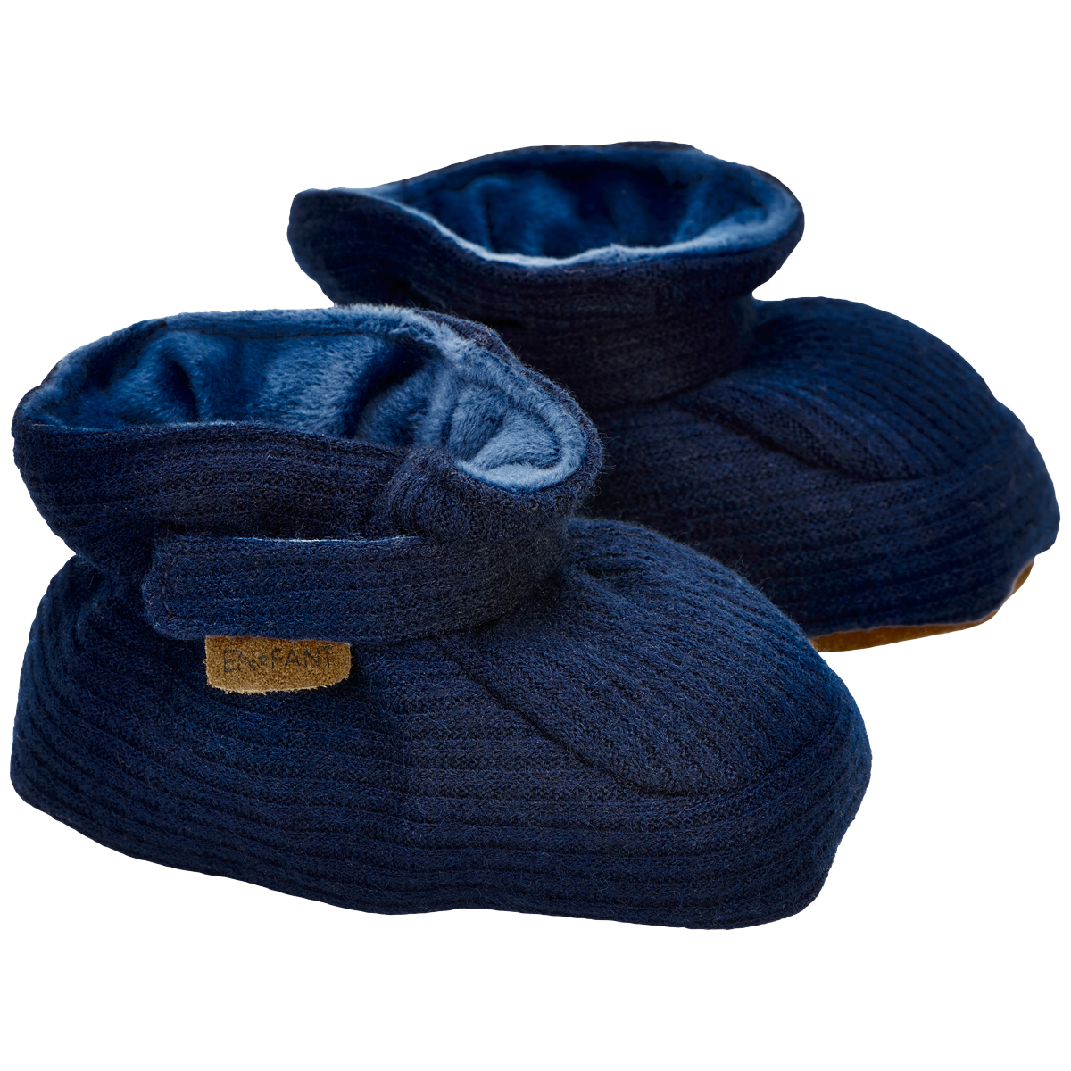 En Fant bløde baby hjemmesko. Super fine og bløde hjemmesko til baby med velcrolukning og elastikkant rundt om anklen. Bunden er lavet af ruskind, så baby bedre kan stå fast og tager på samme tid noget af kulden fra gulvet. Indersiden er med blød for, så